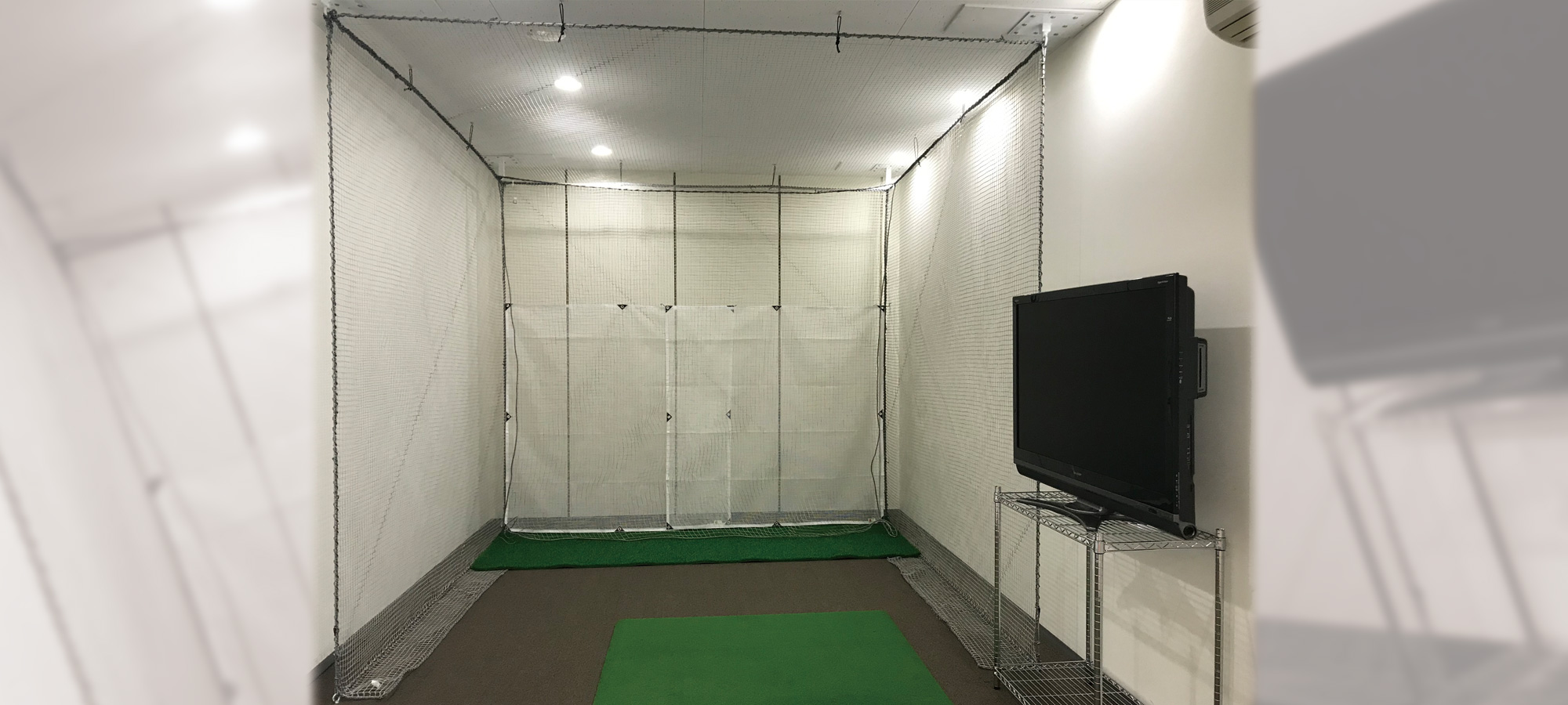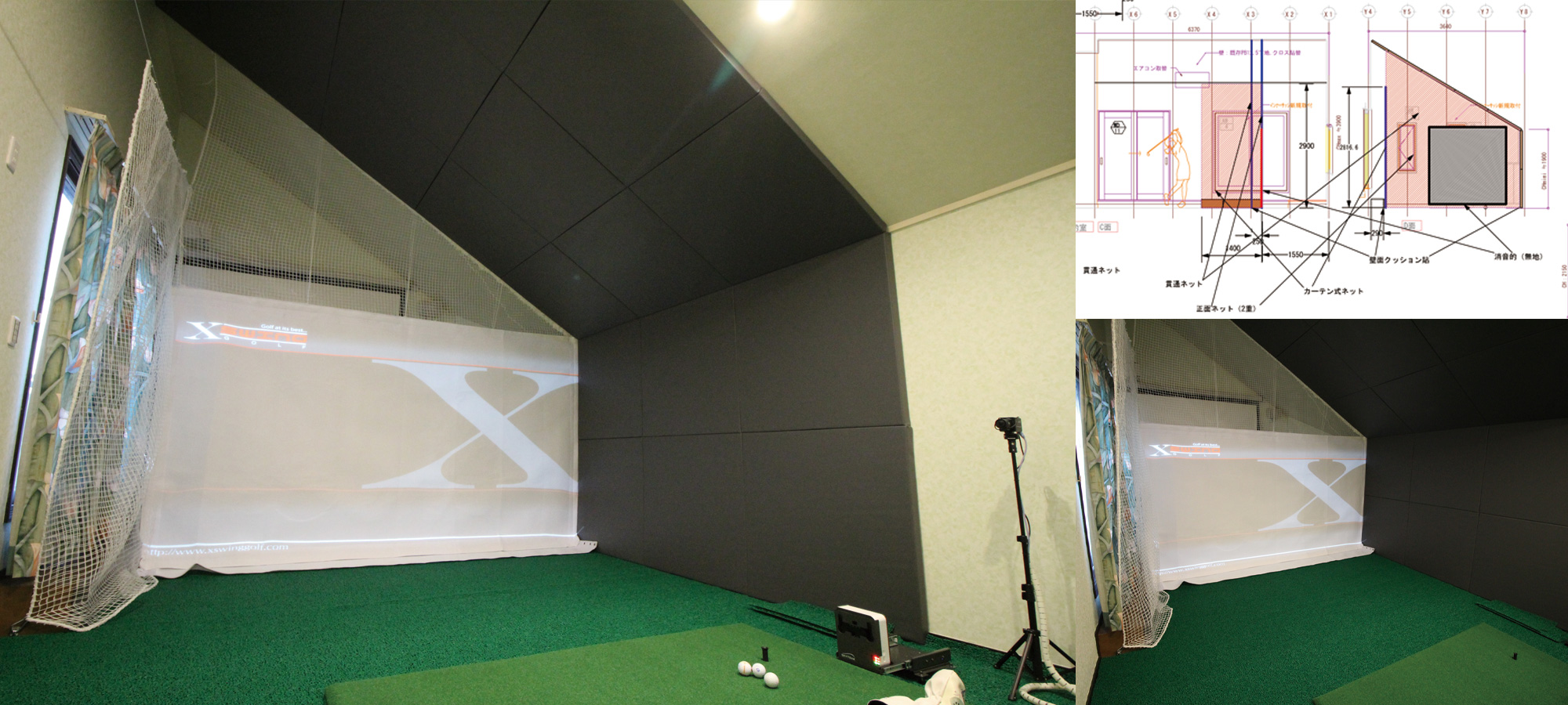 右側の通路を確保の為、ネットを併用。ゴルフ専用部屋であることから、コスパを考え、固定のネット仕様となっている